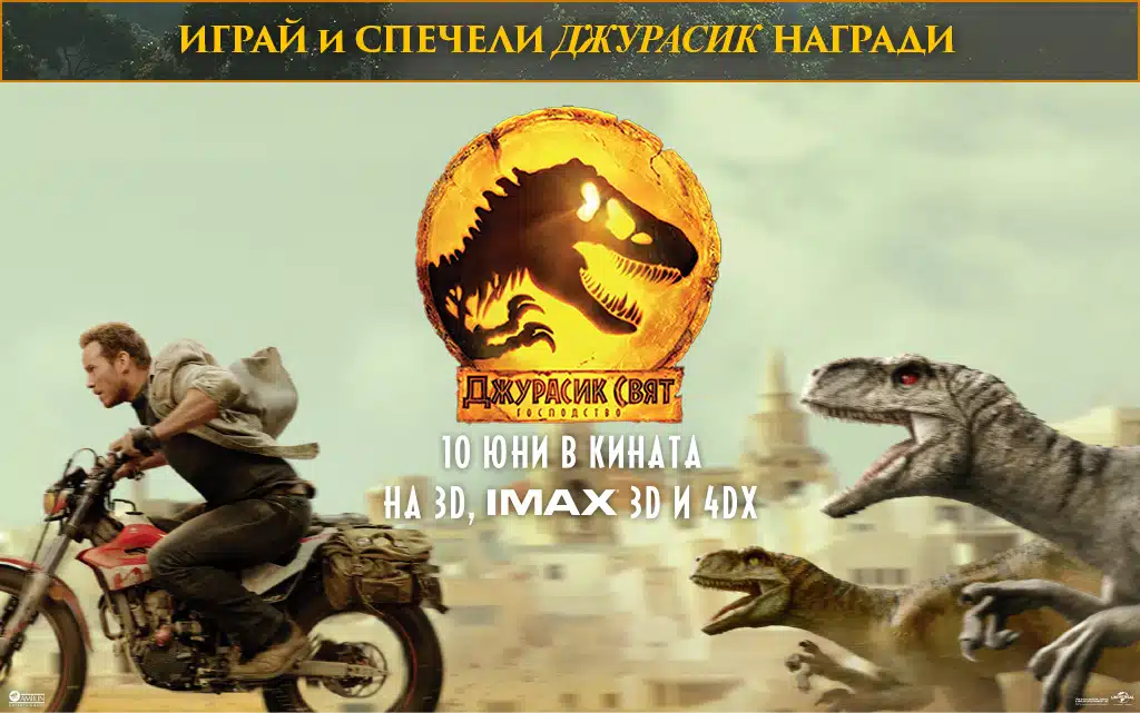 Изживейте епичния завършек на ерата Джурасик с „Джурасик свят: Господство“ от 10 юни в кината на 3D, IMAX 3D и 4DX и играйте за страхотни Джурасик награди в дните преди премиерата.