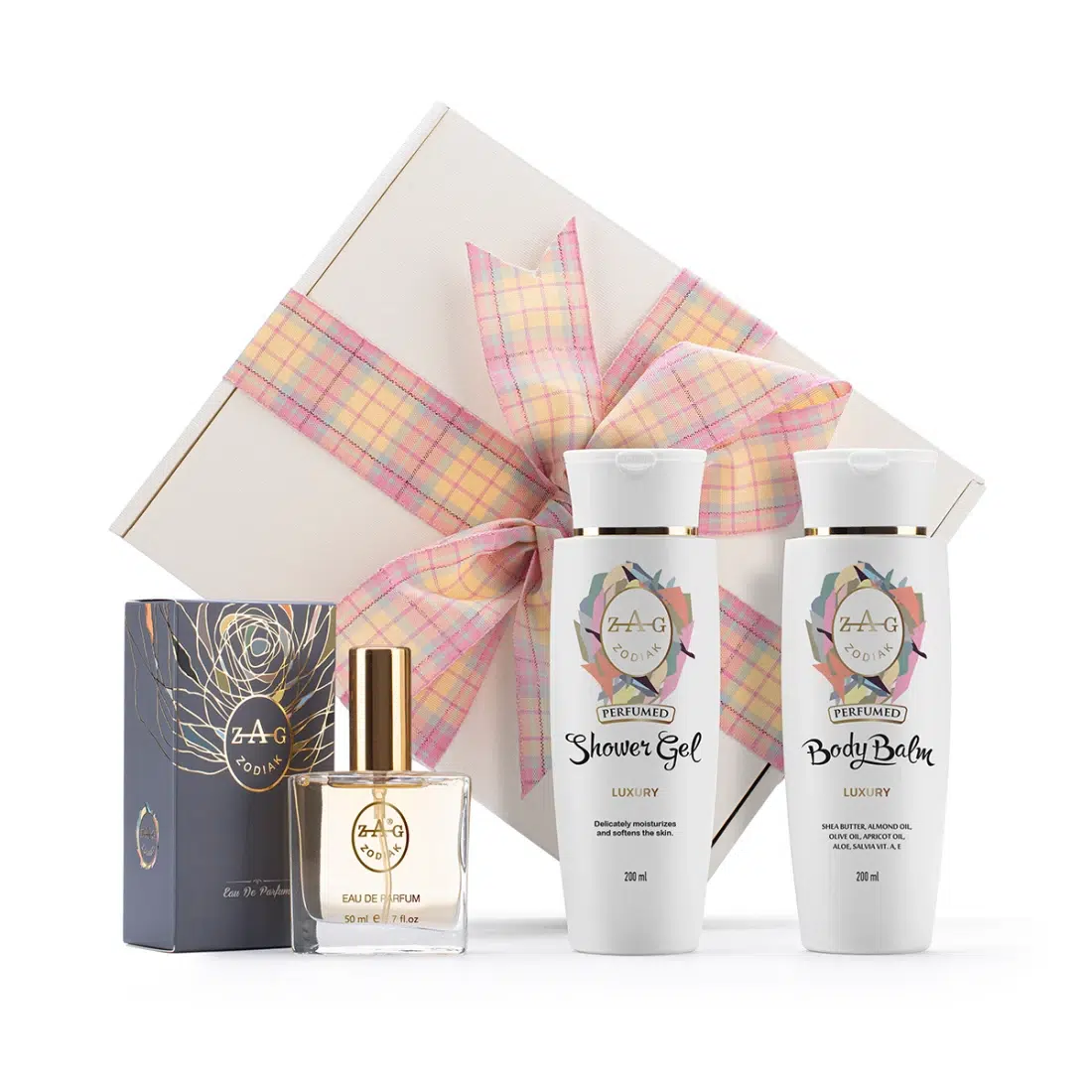 Комплектът се състои от: Парфюмна вода ZAG Zodiak 565 FN – 50 мл., Парфюмен балсам за тяло ZAG Zodiak 565 FN – 200 мл. и Парфюмен душ-гел ZAG Zodiak 565 FN – 200 ml.