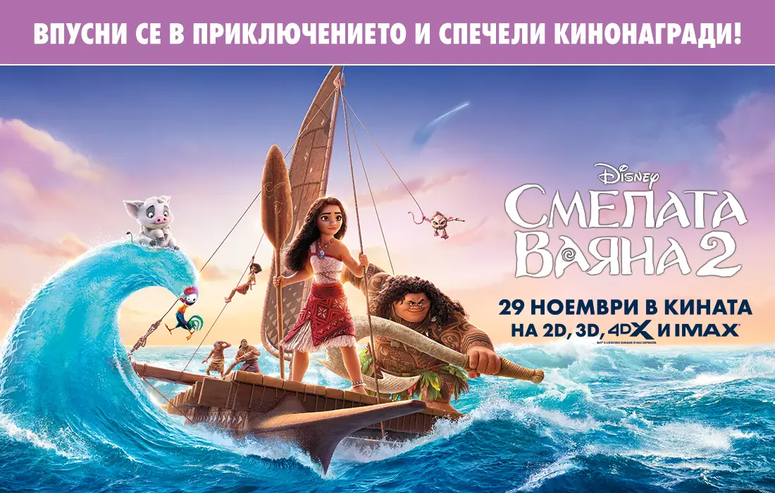 Последваме „Смелата Ваяна 2“ от 29 ноември само в кината на 2D, 3D, 4DX и IMAX, а в дните преди премиерата © След 5 • Забавления за четене ви дава шанс да спечелите кинонаграда от филма – комплект от ключодържател и шапка, чаша със сламка, платнена чанта, раница или книгата „Смелата Ваяна 2“ от поредицата „Чародейства“ на издателство Егмонт.
