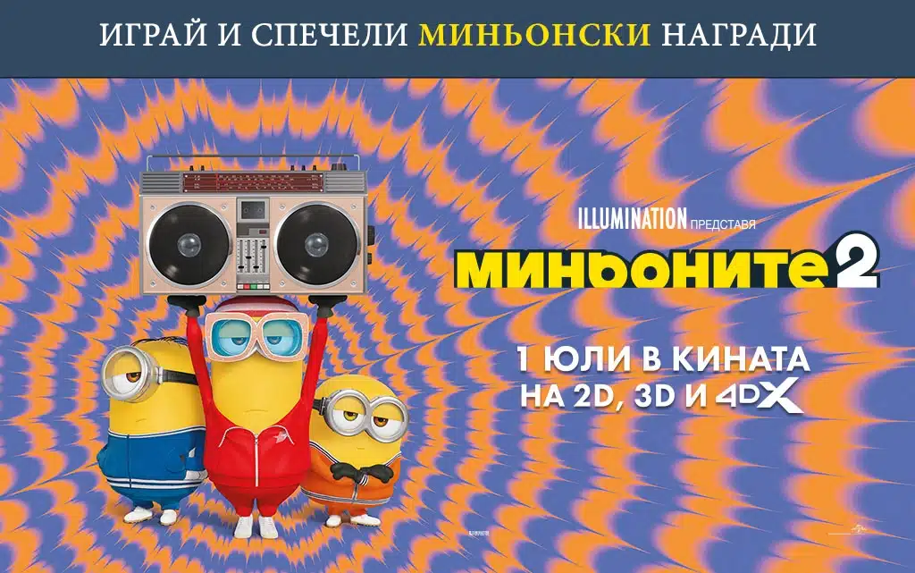 Присъединяваме се към бандата на „Миньоните 2“ от 1 юли само в кината на 2D и 3D, а в дните преди премиерата играйте и спечелете страхотни кинонагради с © След 5 • Музиката на твоя живот – оригинална миньонска чанта за кръст, оригинална миньонска раница или оригинални миньонски слушалки.