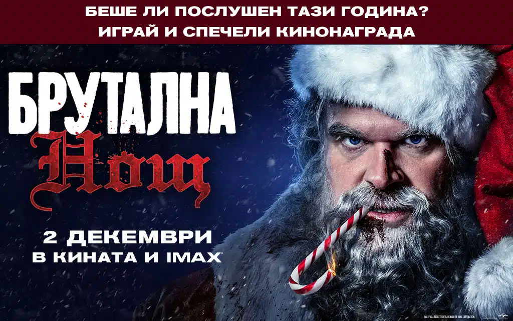 Отдаващ почит на коледни класики като „Умирай трудно“ и „Сам вкъщи“, „Брутална нощ“ ще предложи на зрителите в киносалона едно различно, празнично развлечение. Дядо Коледа ще раздава справедливост от 2 декември само в кината и IMAX, а в дните преди премиерата © След 5 • Мъжката зона ви дава шанс да спечелите двоен кинобилет за филма.