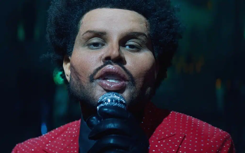 Визуализацията показва The Weeknd с бляскаво червено сако и вече махнал бинтовете от окървавеното си лице. Сега то е подуто и обезобразено от ботокс, филъри и пластична хирургия, като се виждат и белезите от операциите в корените на косата му.