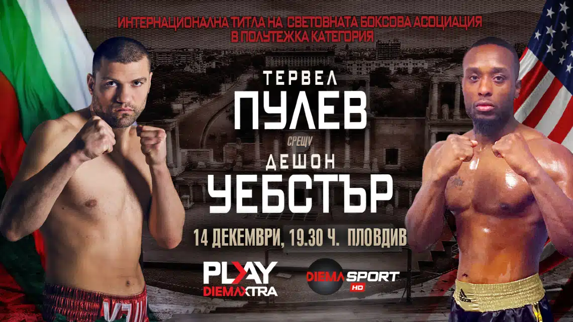 Големият боксов двубой между Тервел Пулев и Дешон Уебстър очаква зрителите в ефира на Diema Sport след броени дни. Мачът ще се състои на 14 декември в зала „Колодрума“ в Пловдив и може да бъде гледан чрез канала от пакета Diema Xtra, както и на абонаментната стрийминг платформа Play Diema Xtra.