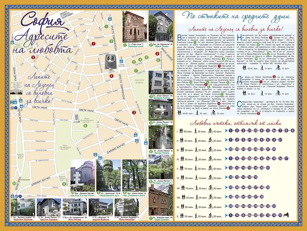 Ако сте сантиментално настроени, ще можете да обходите маршрутите между тях с обекта на своите чувства. А защо не и да се целувате на всяко от 47-те места. За по-прагматичните времето за изминаването на разстоянията между софийските адреси на любовта е измерено пеш, с велосипед, с тротинетка…