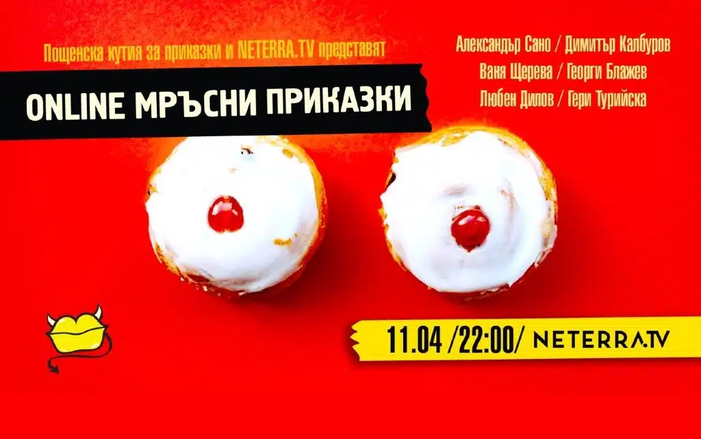 Бъдете част от първите „Online Мръсни Приказки 18+“ на 11 април. Началото е в 22:00 ч. Участие ще вземат Александър Сано, Ваня Щерева, Любен Дилов, Георги Блажев, Димитър Калбуров и Гери Турийска – Козева.