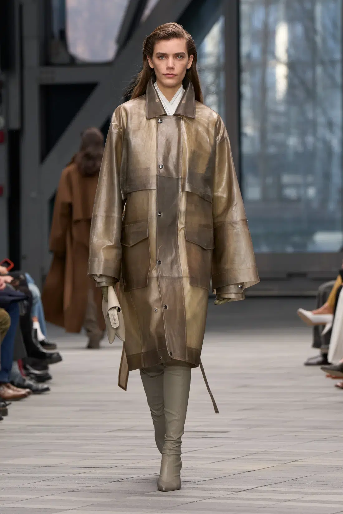 Белите яки изпъкват като графичен акцент, байкърските яки внасят суровост, а шърлинг яките еволюират в палта. Текстурите и цветовете изграждат урбанистична палитра от неутрални и приглушени тонове, озарявани от мандаринови и бордо нюанси. Материите варират от вълнени тъкани за костюми до рипсено трико, кадифе, сатен, памук, гросгрейн, spazzolato и плътни или прозрачни кожи.