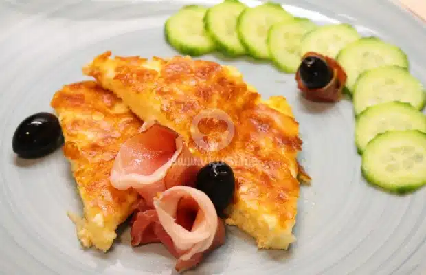Разбиваме яйцата в дълбока купя. Прибавяме млякото, настъргания кашкавал и натрошеното сирене. Овкусете с пипера и индийското орехче (не е необходимо да добавяте сол). Накрая прибавете брашното, предварително смесено с бакпулвера. Намаслете добре тавата, в която ще печете кашкавала и изсипете сместа. Печете за около 20 – 25 минути на 180 градуса.