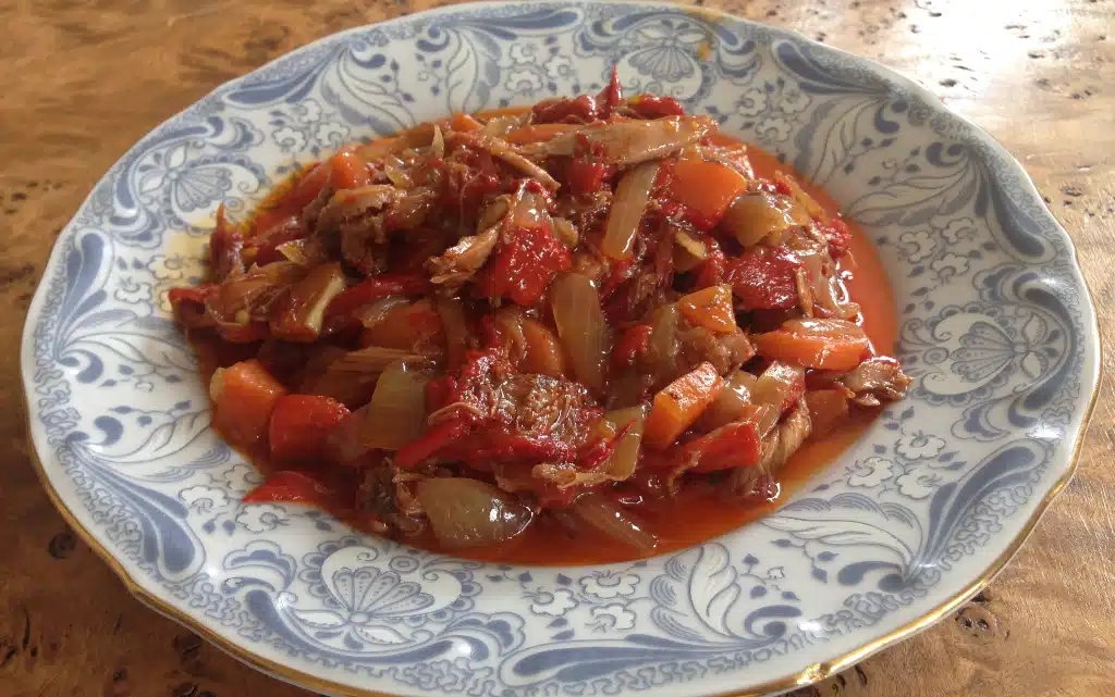 В дълбока тенджера се слага олиото и се поставя на котлона. Когато олиото се сгорещи, се поставят лука и морковите, докато омекнат леко. След това се добавят всички останали съставки, без заешкото месо и чесъна. Бърка се непрекъснато.