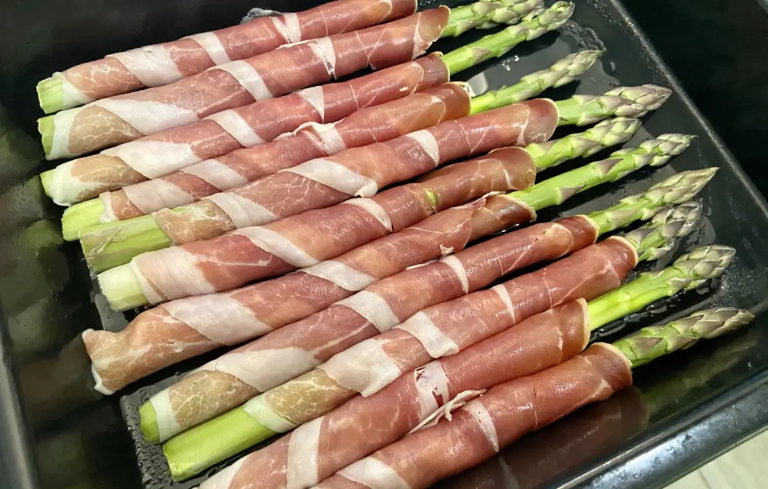 Стеблата на аспержите се обелват с картофобелачка, като се запазват върховете. Най-долната част на стеблото се маха (около 1-2 см). Около всеки стрък аспержи се увива плътно по един слайс хамон.