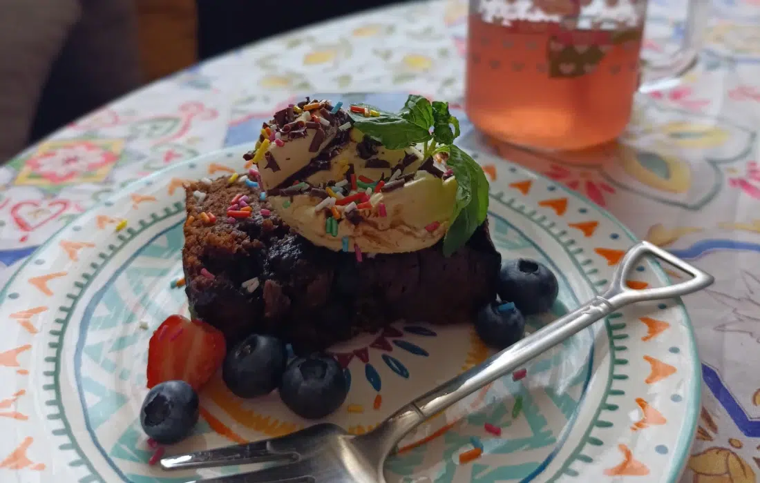 Изсипваме сместа във формичка с хартия за печене. Печем на 200 градуса с вентилатор. Изчакваме готовия бананов кекс с какао и боровинки да изстине и тогава разрязваме. Поднасяме със сладолед.