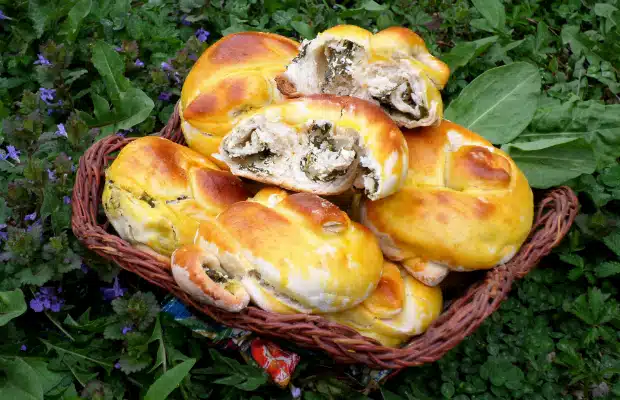 Разделете тестото на 8 до 10 еднакви топки. Всяка една разточете на елипса с дължина около 25 см. Разпределете сместа равномерно. Навийте на руло и завържете на възел. Така пригответе всички банички.