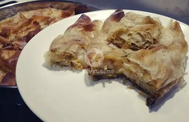 Слагаме равномерно от плънката върху всяка кора и когато баницата е готова и наредена в тавата, се залива с предварително разтопеното масло. Пече се в предварително загрята фурна на 180 градуса за 30-35 минути.