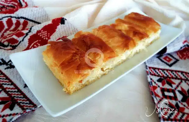Баницата се разрязва напречно през рулата на 4 и се залива с прясното мляко, смесено с останалото масло. Пече се в предварително загрята на 180’С фурна до зачервяване.