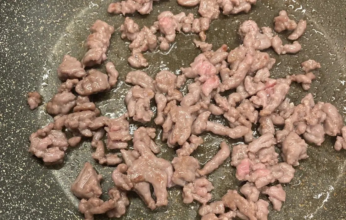 Изсипваме сместа в тигана без допълнителна мазнина – каймата вече си е пуснала достатъчно.
