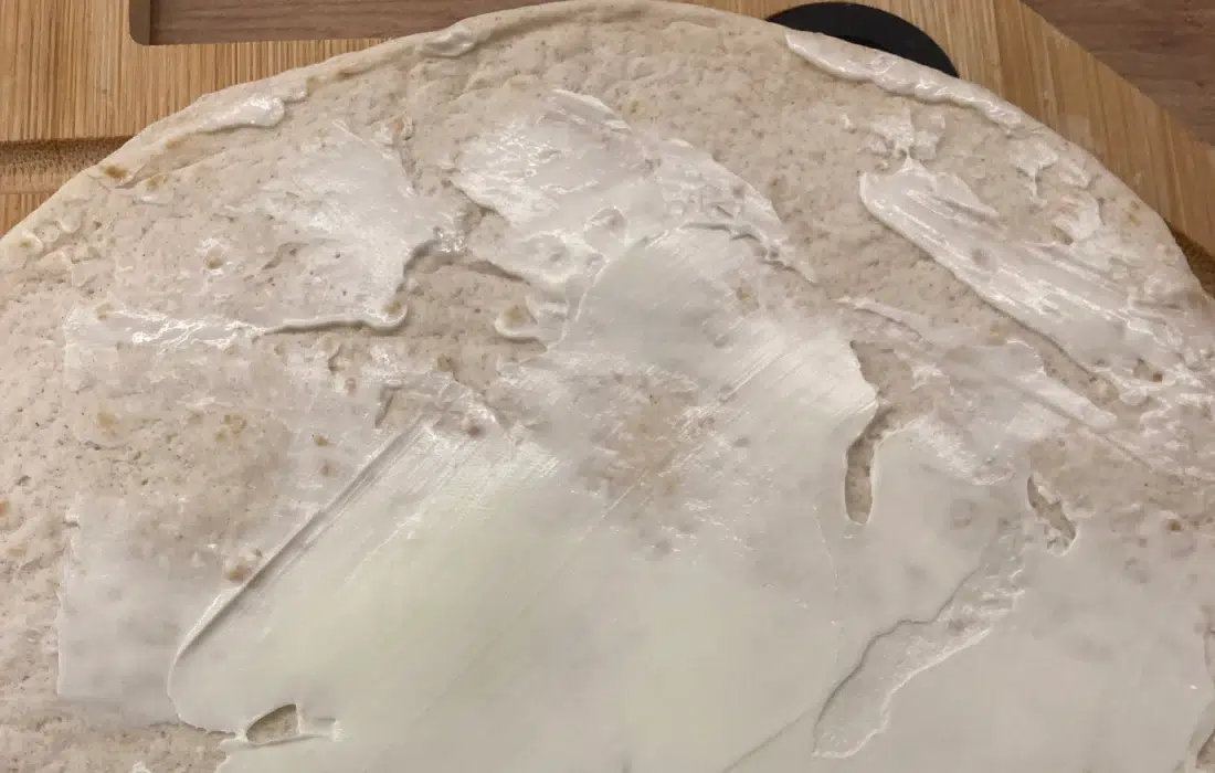 Тортилите намазваме леко с крема сирене, след което ги навиваме заедно на руло. Нарязваме на филийки с дебелина около 1 – 1,5 см.