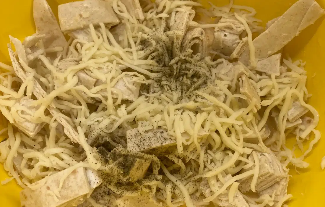 Добавяме нарязаните тортили, моцарелата и каймата към яйчената смес. Подправяме на вкус и разбъркваме добре, докато се получи идеалната бъркотия (нали помним името 😉).