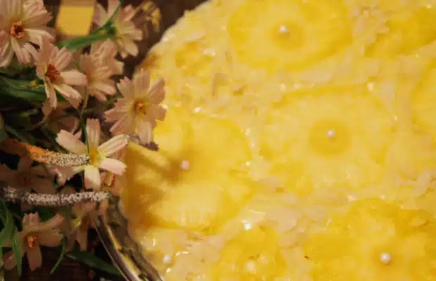 Плодът на ананасовите растения е едър (достига до 5 кг), със сладък сочен вкус и не съдържа семена. Сокът на ананаса има жълтеникав цвят и е с богато съдържание на витамини A, B и C. Днес ви предлагам една рецепта за изключително бърз, лесен и много вкусен сладкиш. Невероятна е комбинацията на ананас и бадеми, но винаги може да използвате друг плод според вкуса ви или сезона.