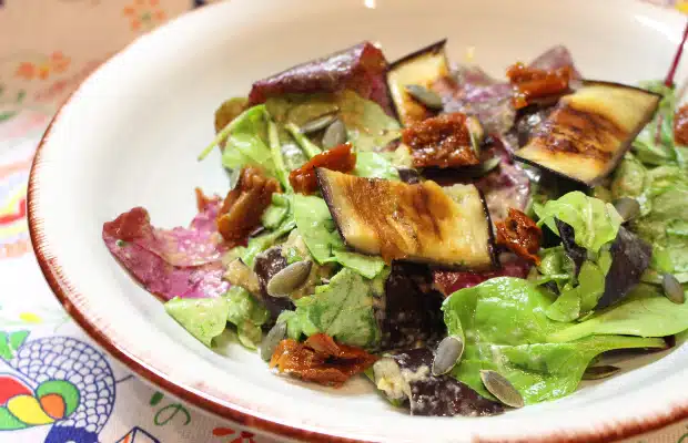 Нарязваме патладжана и сушените домати и добавяме към салатата. Поръсваме нашата бърза салата със семките и сме готови. Наздраве!