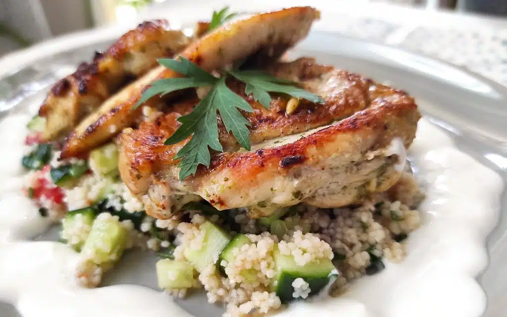 Бързи пилешки филенца върху кускус със свежи зеленчуци