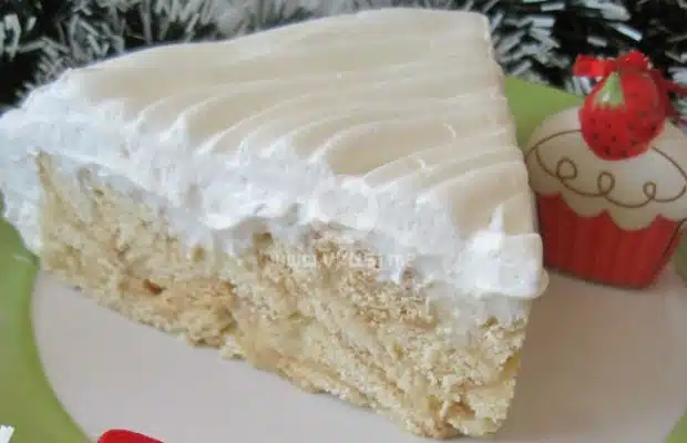През това време се разбива мекото масло. Прибавя се към ваниловия крем, добавят се и бисквитите. Всичко се разбърква много добре. Изсипва се в съд по избор. Покрива се с фолио и престоява в хладилник за едно денонощие. На следващия ден се разбиват белтъците с малко пудра захар, докато станат на сняг и се декорира тортата.