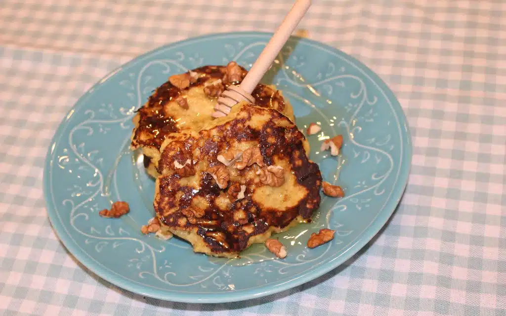 В загрят тиган добавяме малко масло и с лъжица изсипваме от сместа. Печем за минута-две от всяка страна. Готовите палачинки поднасяме с мед и орехи.