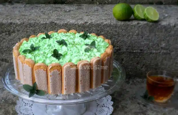 Приберете тортата на хладно за минимум 4 часа. Преди консумация настържете лентички от кората на лайма и декорирайте с листенца прясна мента.
