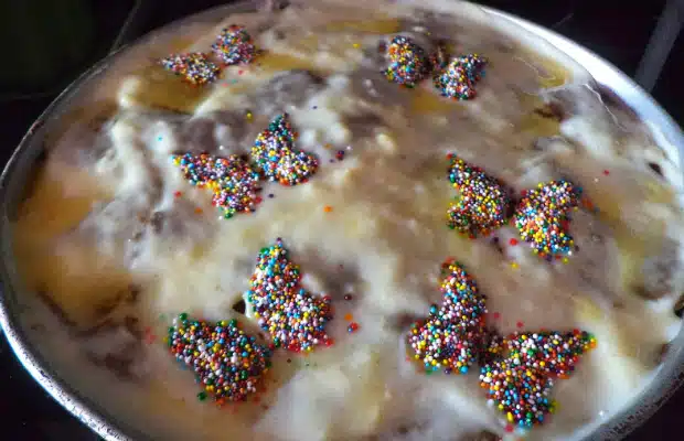 Прясното мляко и захарта се слагат на котлона и се бърка, докато се разтопи захарта – съдът трябва да е подходящ за разбиване с миксер.