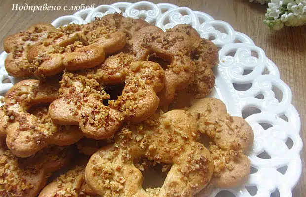 Не са ви необходими сложни продукти, както и не е необходимо да владеете висши кулинарни техники, за да си приготвите тези вкусни домашни бисквитки от маслено тесто с орехова поръска.
