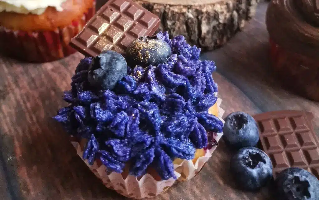 След като мъфините изстинат, започваме с украсата. За сместа разбиваме маслото със захарта. След това добавяме крема сирене и отново разбиваме. По желание добавете цветна боя за сладки. В шприц слагаме сместа и правим различни форми. Добавяме шоколад, боровинки, бонбонки, всякаква декорация по избор.