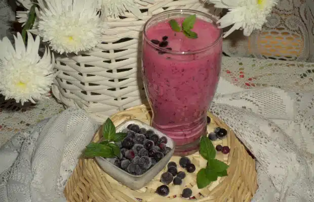 Слагате всички съставки в блендер и смилате добре на висока скорост. Изсипвате във висока купа и пасирате до гладка смес. Изливате в чаши и сервирате с украса от прясна мента.