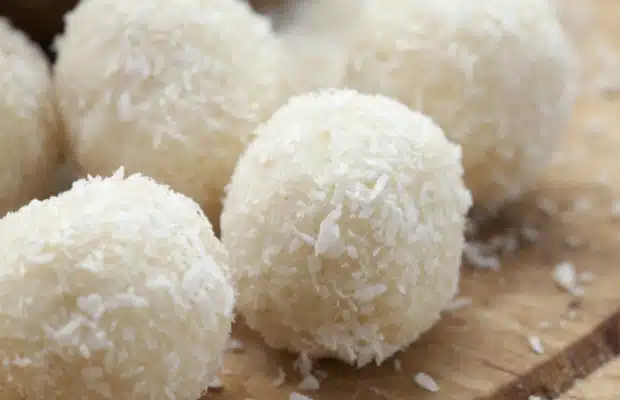 В тенджера смесваме кондензираното мляко, маслото, щипка сол, ванилията и половината от кокосовите стърготини. Готвим на среден огън за 15 минути, като разбъркваме с дървена лъжица. Оставяме сместа да изстине и оформяме топчета, които овалваме в останалия кокос.