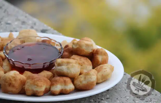 Разточете върху набрашнен плот форми по избор и изпържете в сгорещена мазнина. Отцедете върху кухненска хартия и поднесете със сладко по избор или сирене. Добър апетит!
