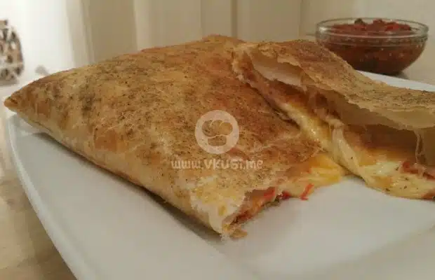 Тестото се разстила върху тавичка, покрита с хартия за печене. Намазва се с домашната лютеница.