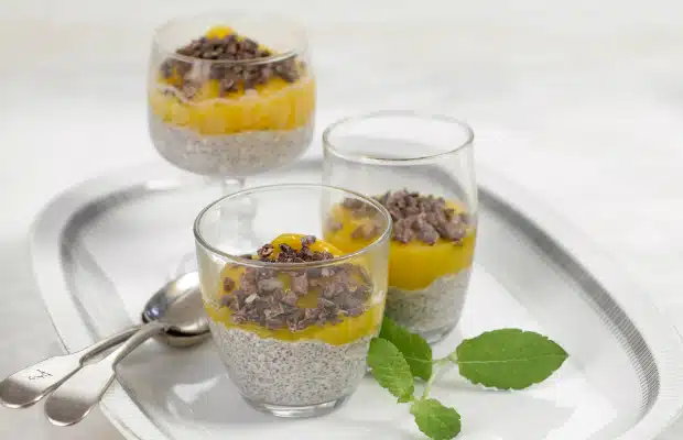 С лъжица сипете сместа с чиа в четири малки стъклени чаши или бурканчета. Покрийте с пюрето от манго, поръсете с какаото и сервирайте веднага.