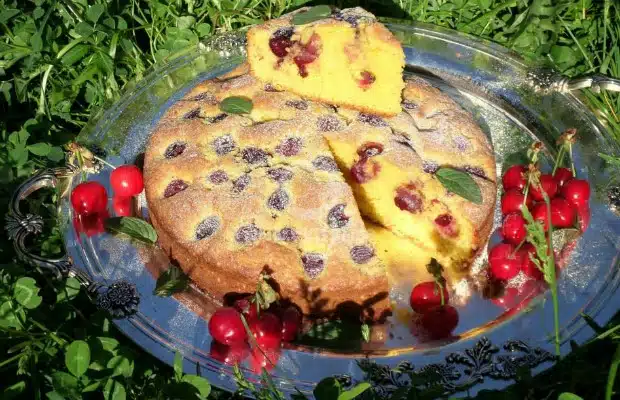 Изсипвате сместа във форма с ринг с диаметър 24 см, на чието на дъното сте сложили хартия за печене, а стените сте намаслили. Отгоре редите изчистените от костилките и дръжките череши и леко притискате.