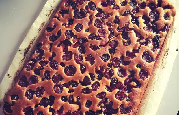 В тава, върху хартия за печене, се изсипва сместа и се нареждат черешите. Пече се на предварително загрята на 220 градуса фурна.