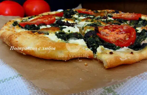 Разстиламе сместа с рикотата върху тестото, отгоре разпределяме равномерно сиренето моцарела, нарязано на кръгчета, сотирания спанак и чери доматите нарязани на кръгчета.