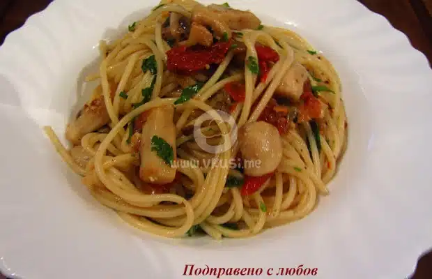 Чеснови спагети с гъби, сушени домати и каперси