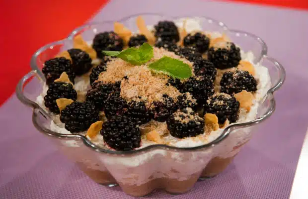 Отгоре нареждаме къпини. В блендер смиламе корнфлейкс и лешници.