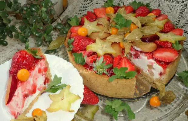 Нарежете карамбола на тънки резени, разполовете ягодите като не отстранявате зеленината им, сливите нарежете на полумесеци, а физалисите покажете от шишулките като ги дръпнете нагоре без да ги късате от плода. Декорирайте с плодовете. Намажете ягодите с малко конфитюр за блясък. Украсете с листенца мента.