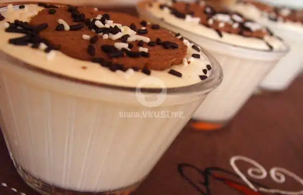 Приготвяме крема според указанията на опаковката. Добавяме пудрата захар и крема сиренето и разбиваме докато се получи гладка смес. Смесваме кафето и уискито. В тази смес потапяме всяка бисквита. Поставяме всяка бисквита в подходяща купичка или чашка, добавяме малко от крема, пак бисквита крем и така до изчерпване на количествата. Украсяваме с бисквита и шоколадови пръчици.