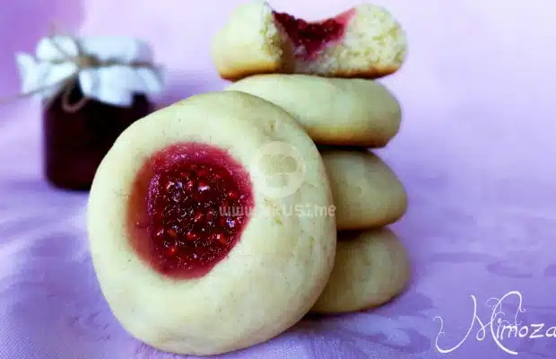 Фурната се загрява на 190 градуса. Взема се 1 пълна супена лъжица (или кръгла лъжица за сладолед). От сместа и се оформя на топче. Поставя се в застлана с хартия за печене тава. С палец се притиска в горната част, за да се образува „гнездо“, в което се слага по 1/2 ч.л. сладко.