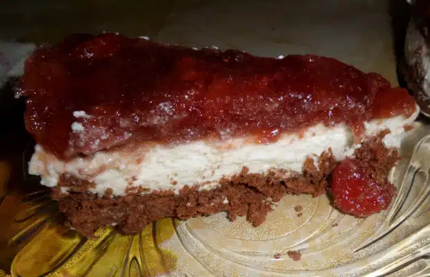 Извадете от фурната и охладете. Затоплете ягодовото сладко на водна баня. След това разстелете върху чийзкейка. Украсете с пресните ягоди.