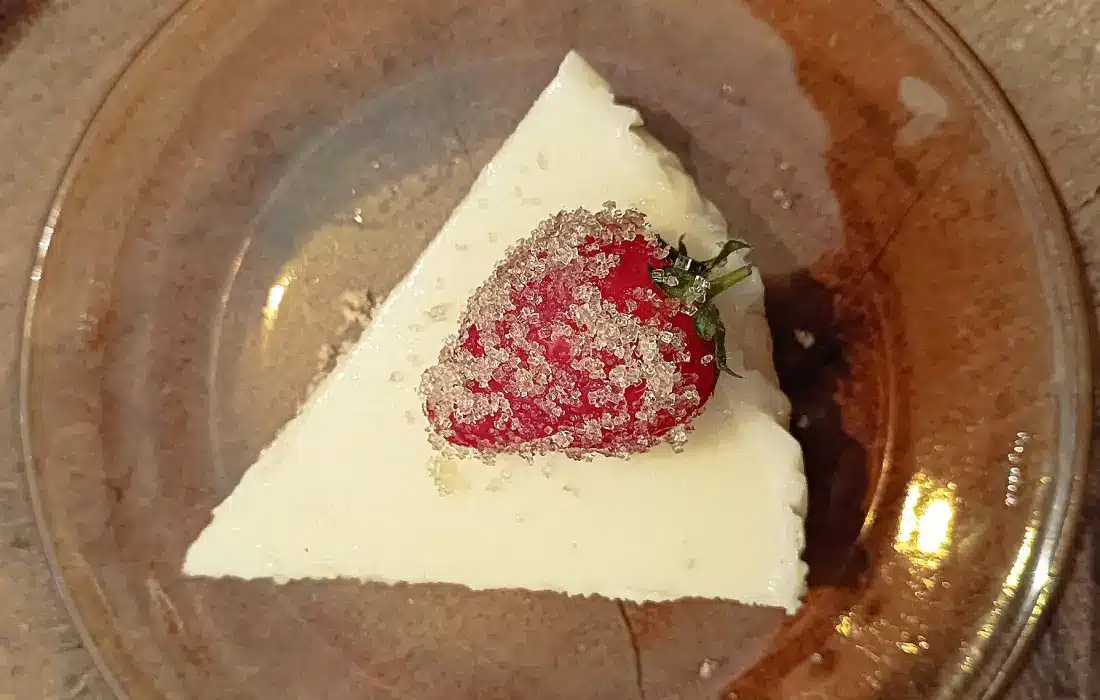 Покриваме с прозрачно фолио и поставяме в хладилник, докато стегне добре. Щом десертът е готов, го разрязваме на парчета, като върху всяко поставяме ягода, поръсена с кафява захар.