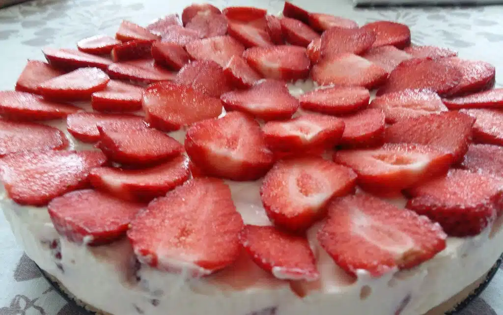 След като цялата смес е стегнала се декорира с ягоди. Ако не харесвате ягоди, може да се залее с конфитюр от боровинки или друг плод по желание. Добър апетит! 😊