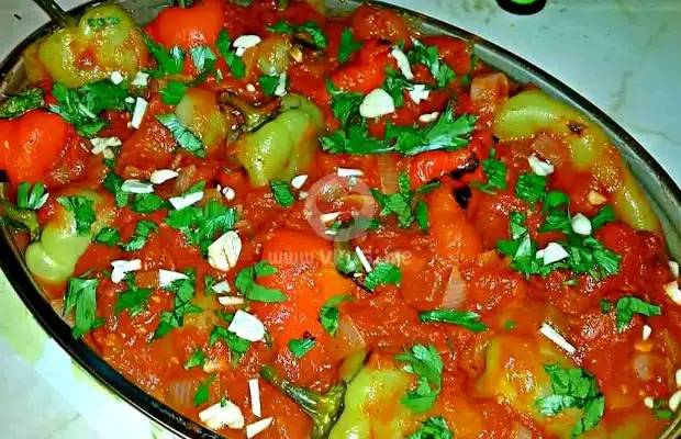 Сипете половината от доматения сос в тавичка, отгоре подредете чушките и залейте с останалия сос. Нарежете магданоза и останалите скилидки чесън на ситно и поръсете готовото ястие.