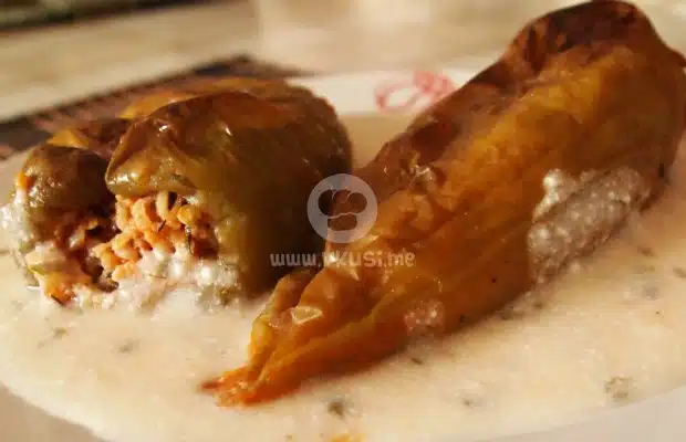 На чушките: Запържваме каймата и моркова, който сме нарязали на ситно. По желание може да добавим и малко лук. Добавяме ориза, доматеното пюре, размито в малко вода и подправките. Добавяме още вода, около 1 чаена чаша. Оставаме сместа да къкри на котлона, докато оризът поеме течността. С готовата смес пълним чушките, които сме почистили предварително. Печем, като в тавата поставяме малко вода.
