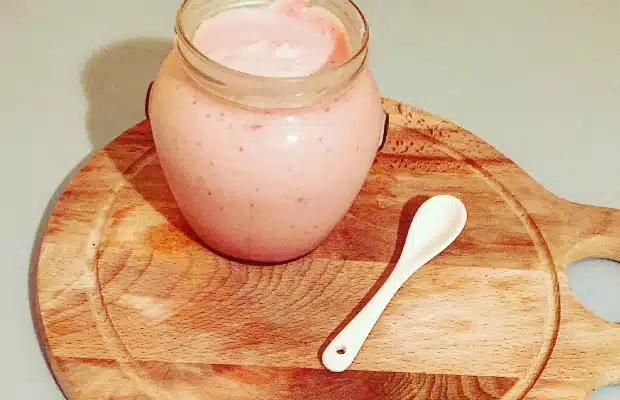 Ягодите, захарта и заквасената сметана се разбиват в блендер (оставете си 3-4 ягодки, който ще разбиете по-късно).