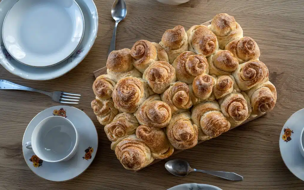 Тестото се разделя на 12 малки топки, всяка се разточва и намазва с масло, след което се реже на две и се оформя на розичка. Подреждат се в тава, покрита с хартия за печене и се оставя още час да втасва.