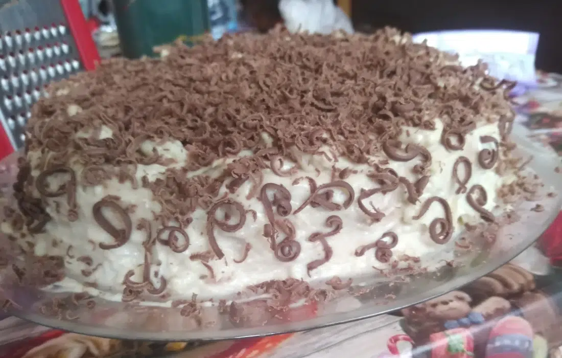 Оставете тортата в хладилник за около 30 минути, след което настържете шоколад и поръсете отгоре.